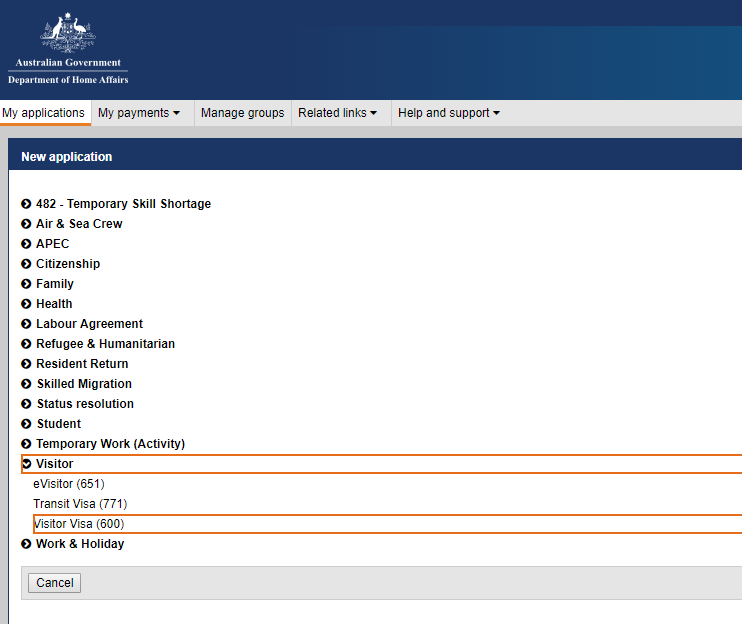 B. Click on VISITOR. Then choose Visitor Visa (subclass 600).