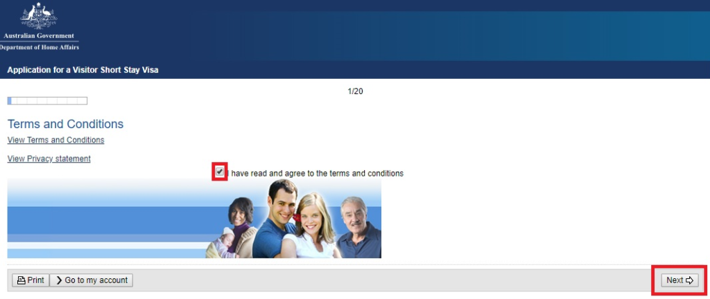 C. Tick on the box to Agree to the website’s Terms & Conditions. Click Next.