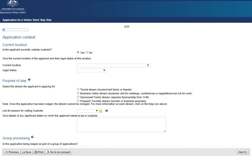 - You can choose from Tourist stream (if you’re traveling for leisure purposes and shouldering your own expenses), Business stream (if you’re travelling for business related activities like attending conferences or meeting a client but not actually working there), Sponsored Family Stream (if you’re travelling for leisure but a relative or someone else from Australia will sponsor your expenses) and Frequent Traveller Stream (not sure what this is about).
