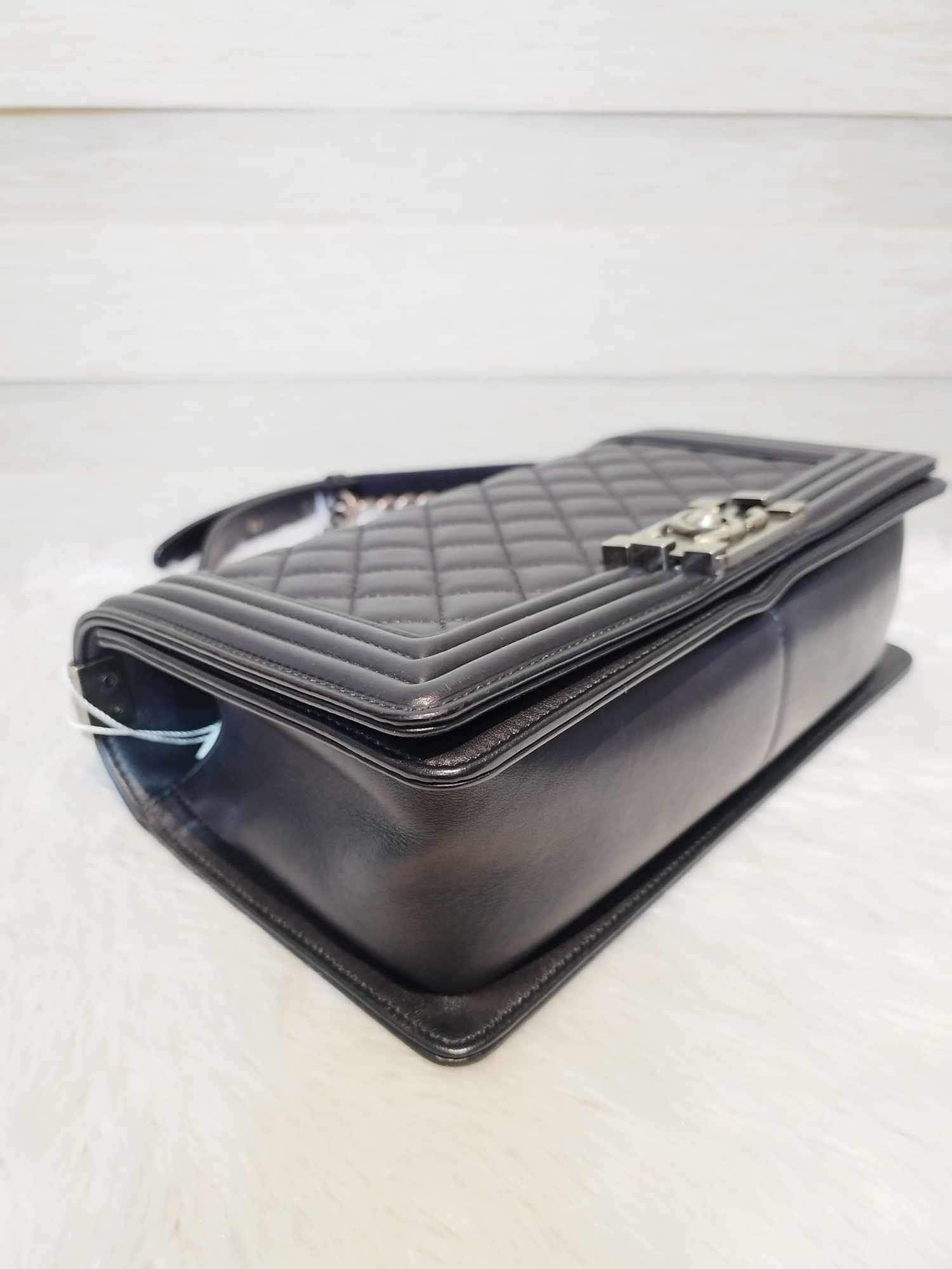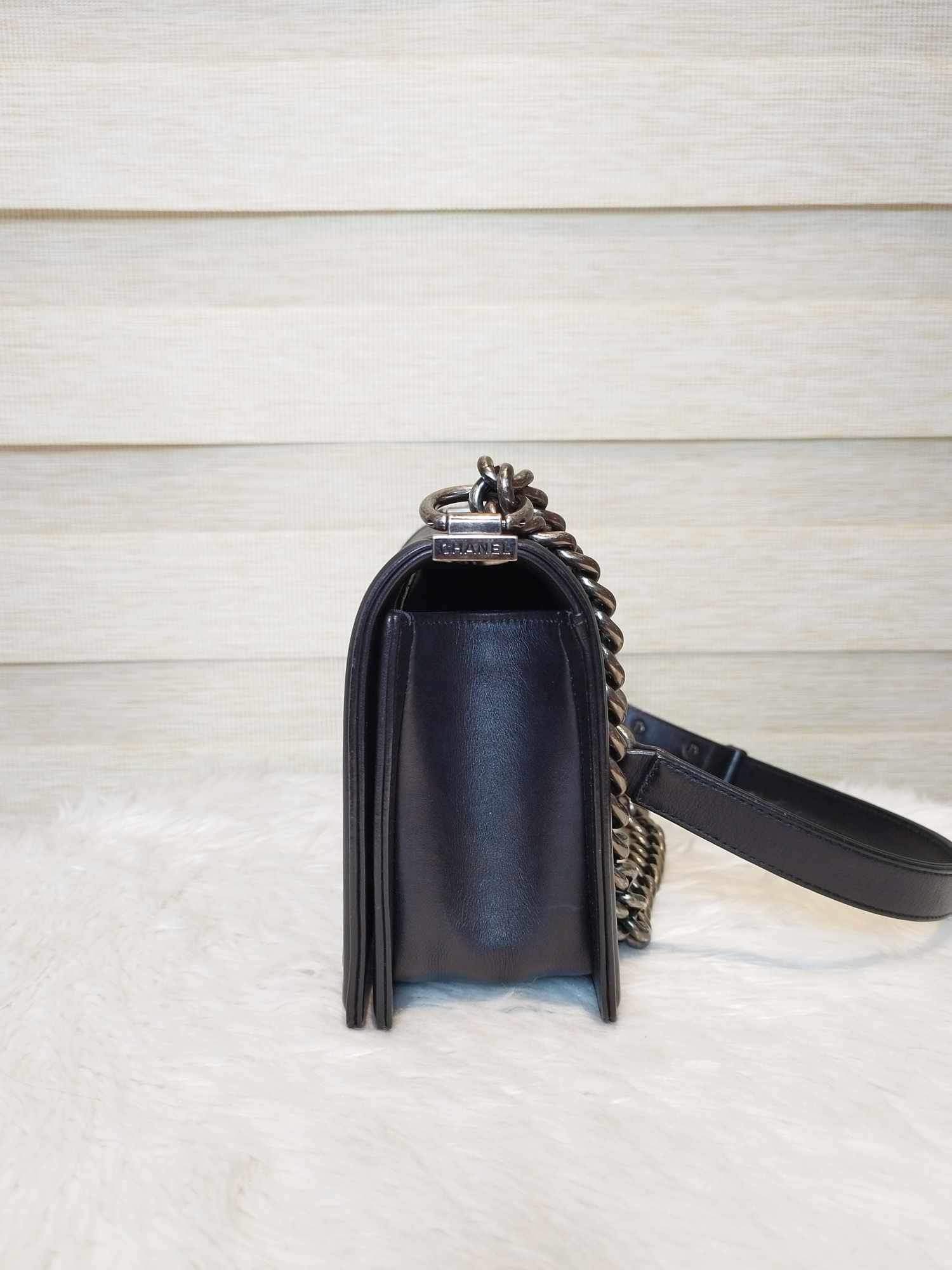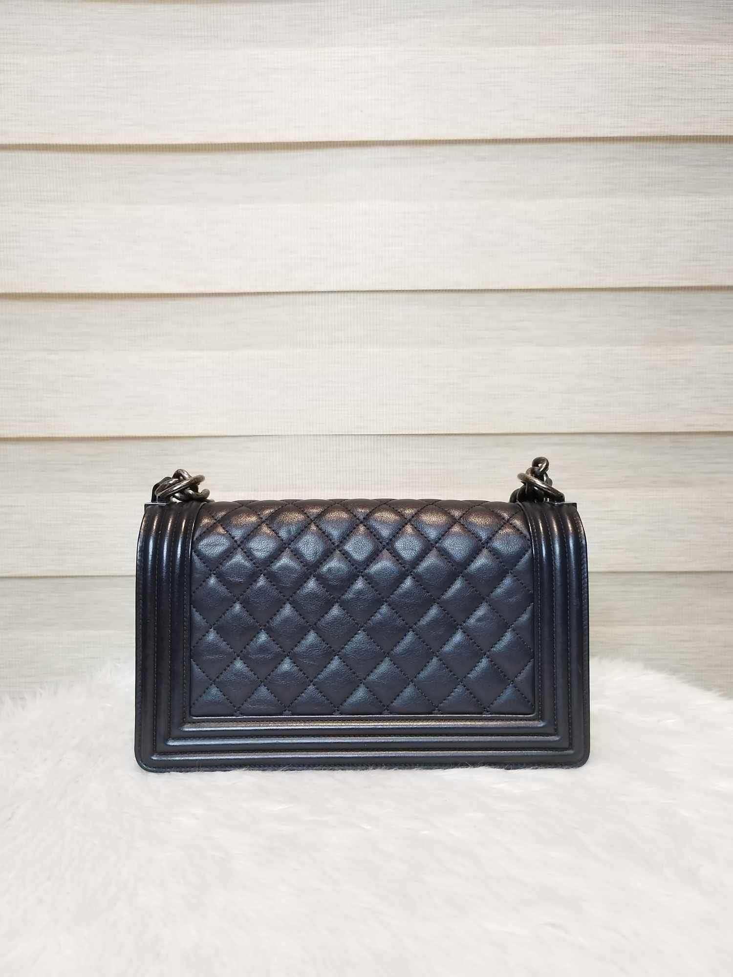 Description: Chanel Le Boy Black Old Medium Ruthenium Hardware Series 20 with hologram, authenticity card, receipt, dust bag, care booklet, and box in Excellent Condition 9/10 😊💜